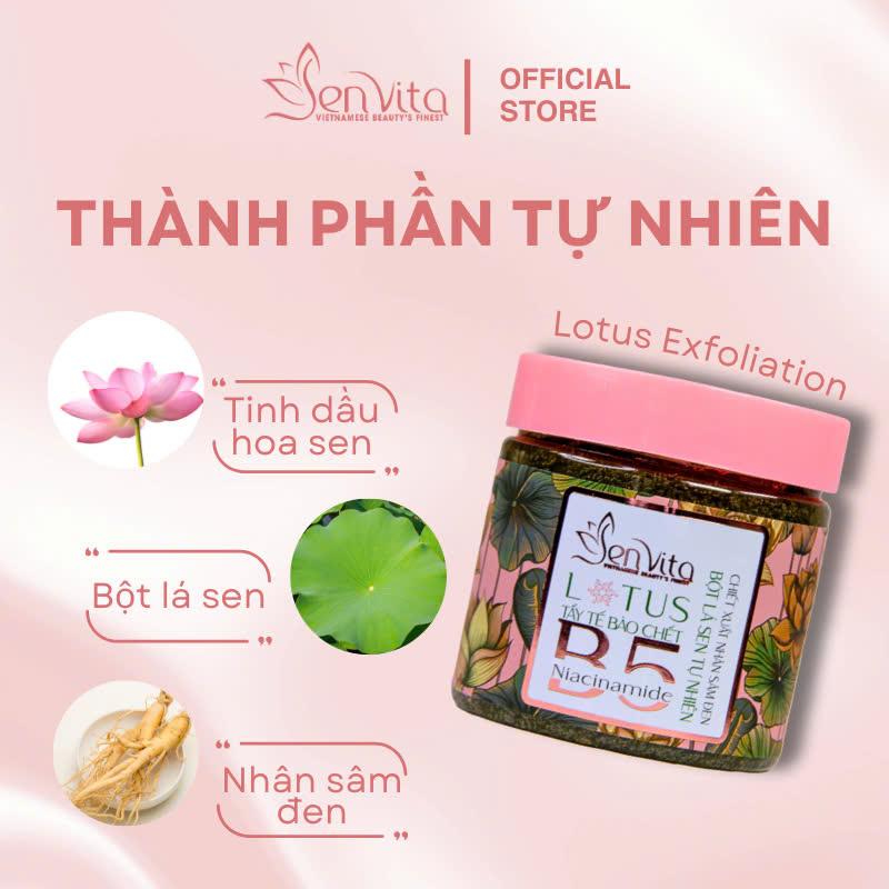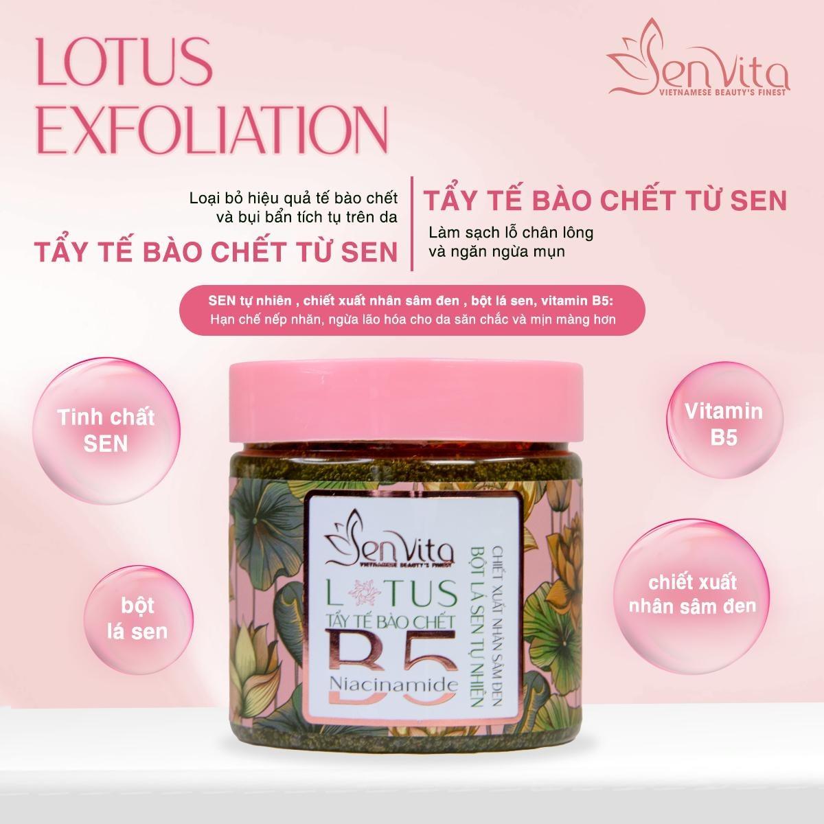 | Ưu điểm và khác biệt của Tẩy Tế Bào Chết Lotus Exfoliation: là sự kết hợp các dưỡng chất được chưng cất chiết xuất từ Sen tự nhiên và Bột lá Sen sấy lạnh công nghệ thăn hoa, chiết xuất Nhân Sâm Đen Hàn Quốc (Hắc sâm), Niacinamide,Vitamin B5 giúp làm sạch sâu hiệu quả tế bào chết và bụi bẩn, lớp trang điểm thừa tích tụ trên da, làm sạch thông thoáng lỗ chân lông sâu và ngừa mụn, giảm mụn, dưỡng sáng da, ngăn ngừa và làm giảm các dấu hiệu lão hóa nám sạm da, hổ trợ hạn chế nếp nhăn, cho da săn chắc mịn màng hơn, giúp dưỡng sáng da, giữ ẩm, cấp ẩm cao, thẩm thấu sâu vào da hơn, tăng hiệu quả của các sản phẩm chăm sóc da khác. |